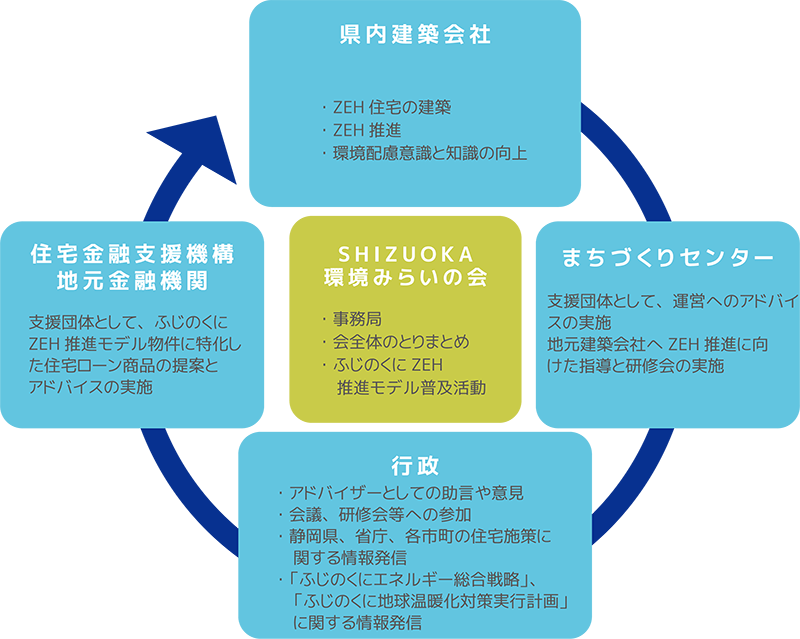 「SHIZUOKA環境みらいの会」では、住宅の脱炭素化目標と理念に共感した静岡県内の企業がパートナーを組み、これから住宅を建築される方々が、質の高い快適な暮らしと地球環境に貢献できるZEH住宅を、静岡県内どこでも標準的に手に入れることができることを目指します。