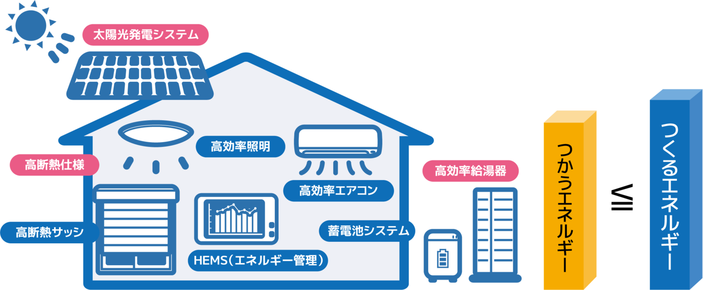 ZEH(ゼッチ)(ネット・ゼロ・エネルギー・ハウス)とは、「外皮の断熱性能等を大幅に向上させるとともに、高効率な設備システム(LEDなどの高効率照明、高効率エアコン、高効率給湯器)の導入により、室内環境の質を維持しつつ大幅な省エネルギーを実現した上で、太陽光発電などの再生可能エネルギーを導入することにより、年間の一次エネルギー消費量の収支がゼロとすることを目指した住宅」です。