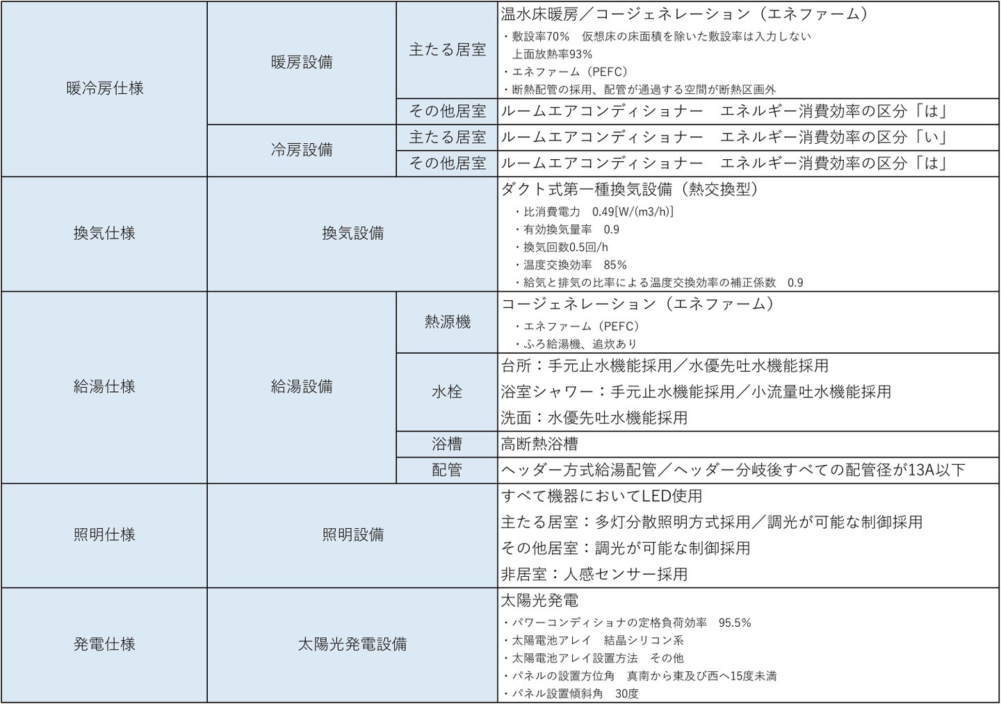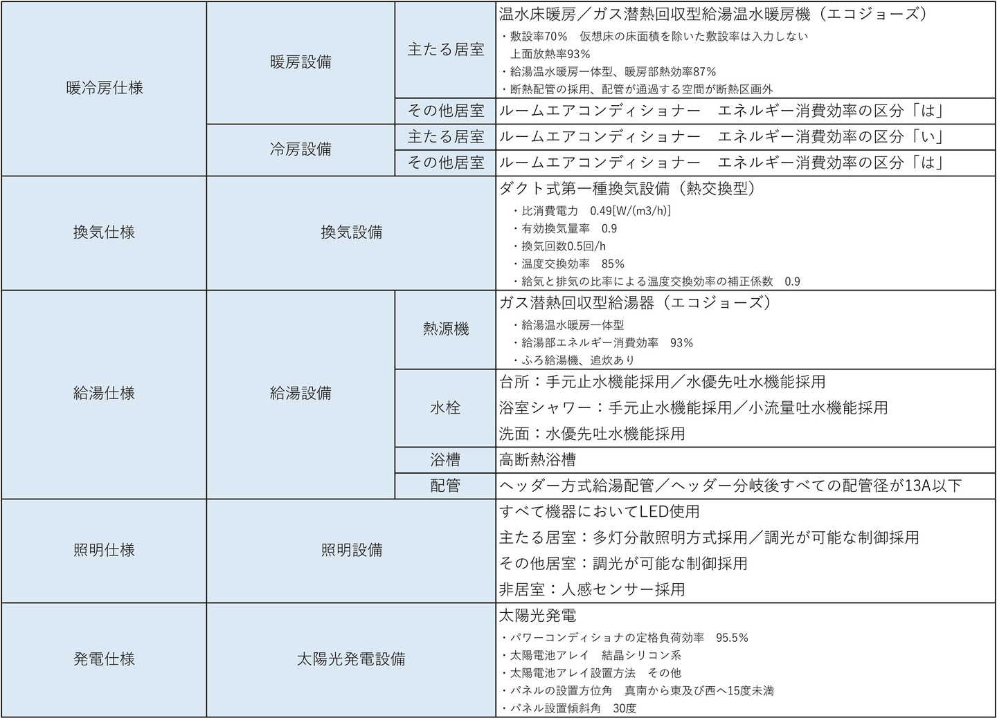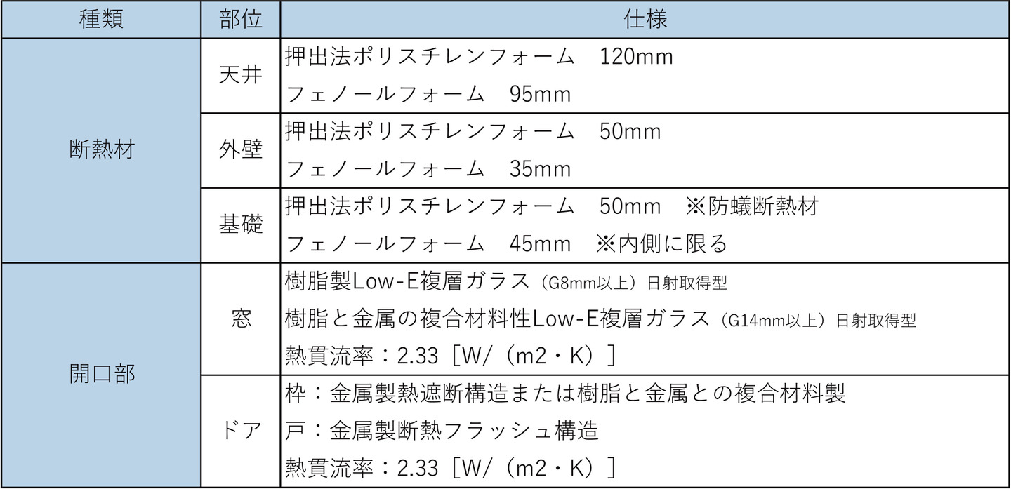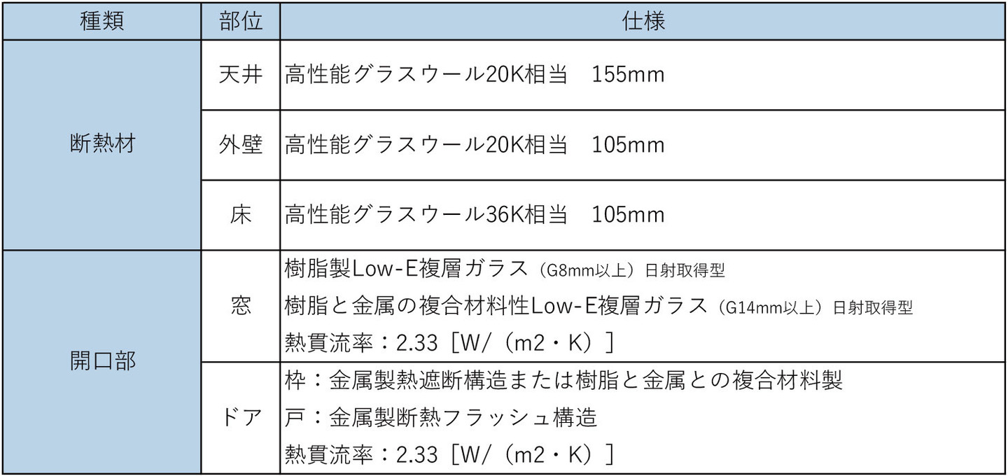 こちらでは、ZEH基準について、具体的なイメージを持っていただくことを目的に、断熱材や開口部からみる外皮性能と、具体的な設備からみる一次エネルギー消費量について、具体的な仕様を例示します。