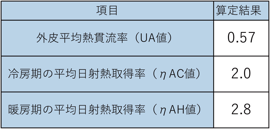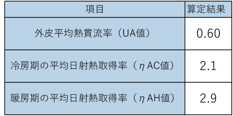 ※住宅の内部から床、外壁、屋根(天井)や開口部などを通過して外部へ逃げる熱量を外皮の面積全体で平均した値で、熱損失の合計を外皮等面積で除した値で、値が小さいほど熱が逃げにくく、省エネルギー性能が高いことを示します。