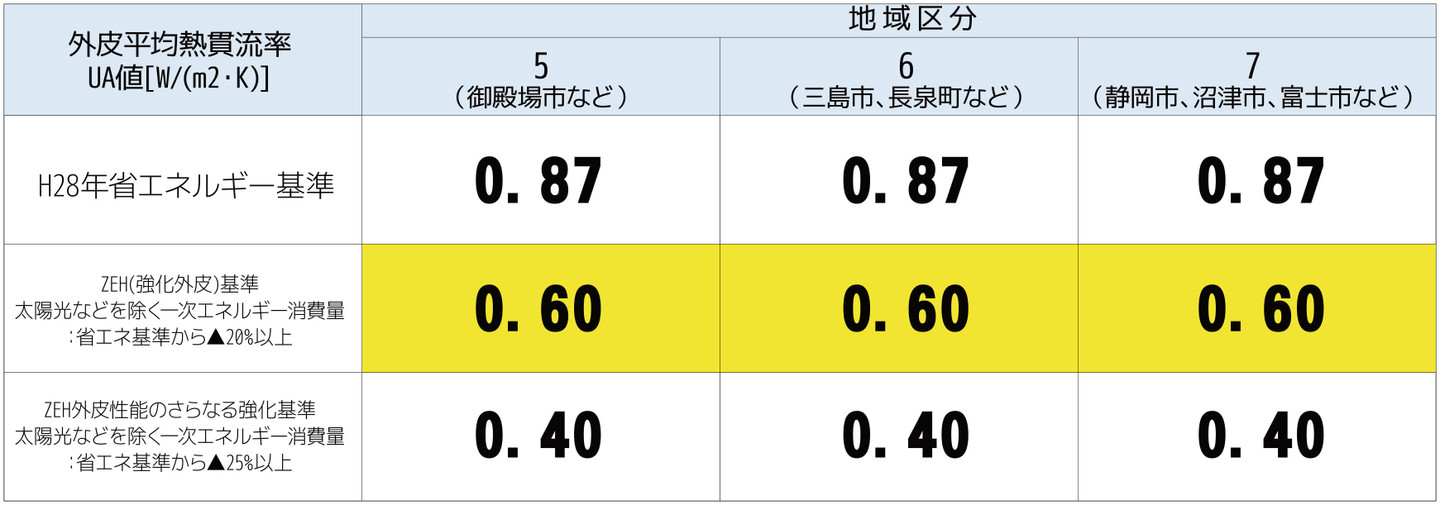 ZEH基準は、地域区分別のUA値および一次エネルギー消費量の省エネ基準からの削減率によって定められており、静岡県内では地域区分により、以下の通りとなっています。