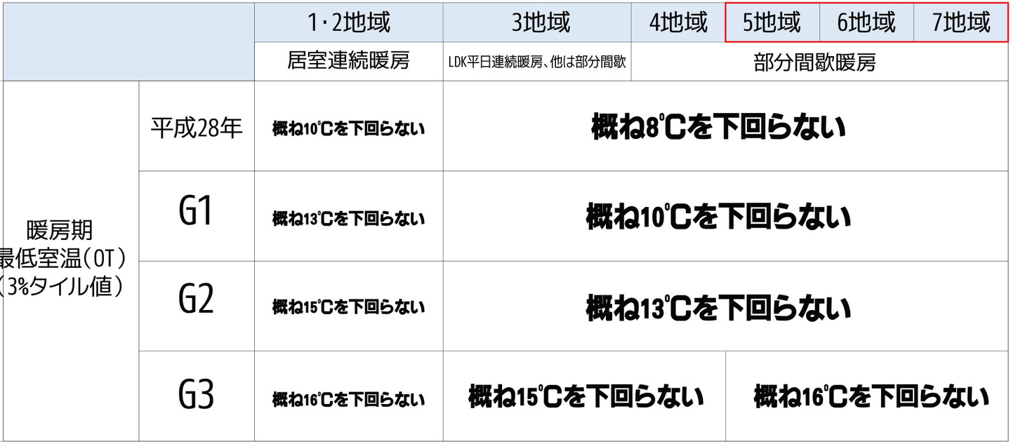 HEAT20が提案する住宅外皮水準G1~G3が目指す目安の一つとして、非暖房室の結露の防止といった住まいの健康を主目的に、冬期における最低の体感温度を掲げています。